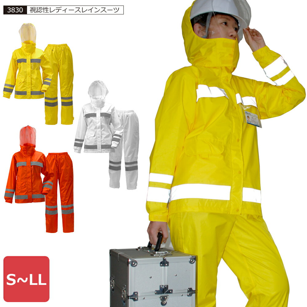 レインウェア レディース 安全 女性用 婦人 婦人用 レインウエア レインスーツ カッパ 合羽 雨具 上下 安全 反射材 反射 蛍光 ヘルメット 作業用 交通整理 道路工事 警備 消防団 梅雨 3830 視認性レディースレインスーツ