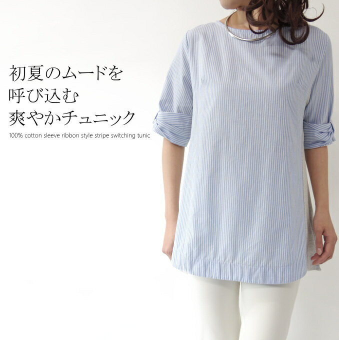 ストライプ柄リボン風スリーブカットソー切替チュニック 50代 ファッション ミセス 40代 60代 春夏 アラフォー リネン 母の日 プレゼント